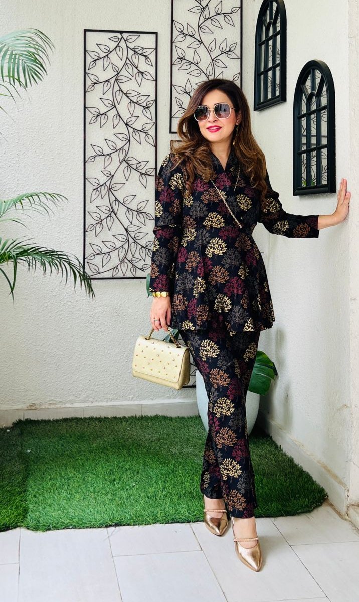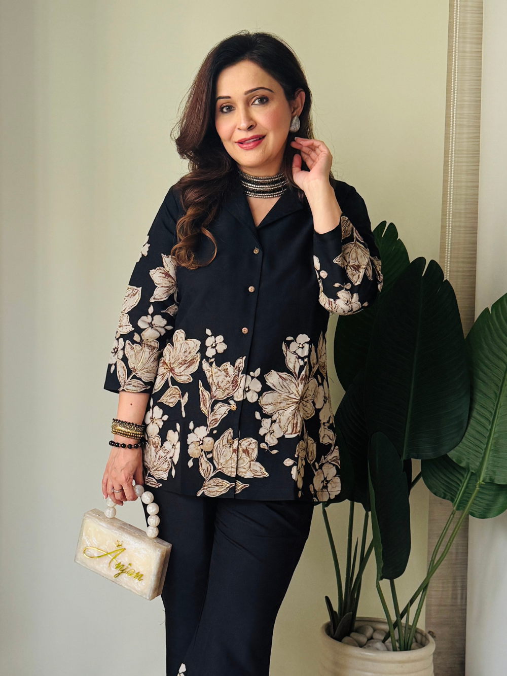 Black Floral Printed Full-Sleeve Premium Chanderi Co-ord Set for Women
