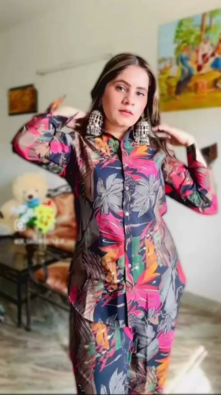 Navy Blue Floral Printed Chanderi Silk Co-Ord Set for Women | Claura