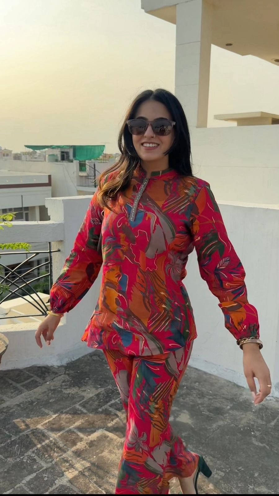 Red Color Ethnic Printed Chanderi Silk Co-Ord Set for Women with Jacket | Claura