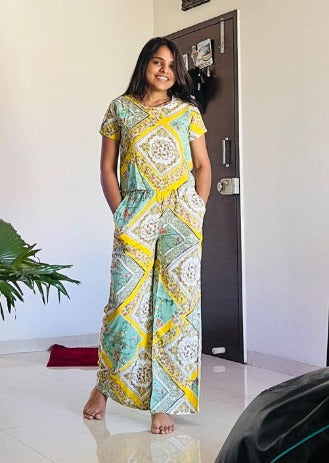 Yellow Floral Printed Viscose Rayon Night Suit for Women | S-XL | Claura