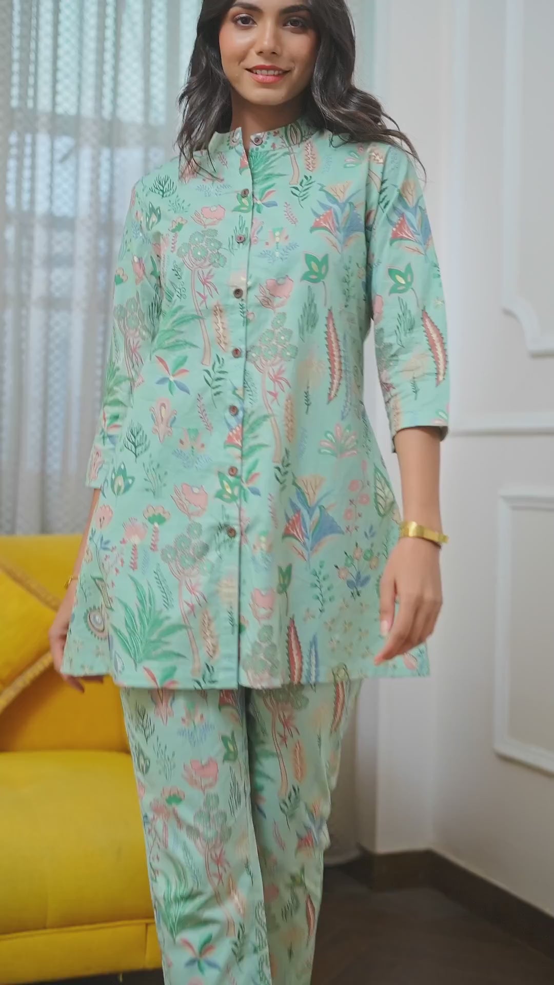 This must-have Co-Ord Set for Women in refreshing green is your new favorite outfit. Made from soft, breathable cotton fabric, it's designed for all-day comfort with a perfect regular fit. The stylish abstract print and chic Mandarin collar tunic make it easy to dress up or down. Whether you're planning a casual brunch, a relaxed travel day, or just an evening out, this set works for everything.