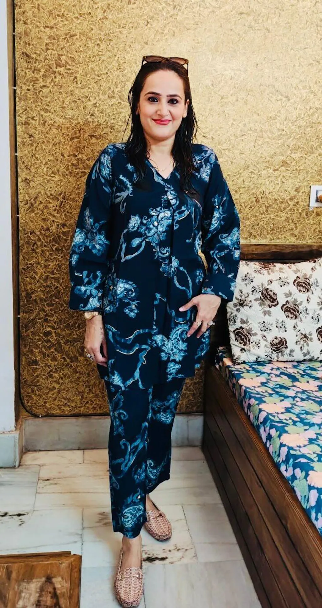 This Co-Ord Set for Women in stunning navy blue and white is your new go-to. Made from premium Chanderi Silk, the fabric feels luxurious yet light. The set features a comfortable regular fit tunic with full sleeves and a classic V-neck, paired with easy-wear trousers that have an elasticated waist. The beautiful floral print makes it perfect for a festive gathering, a weekend brunch, or even travel. Just slip it on and you're ready!