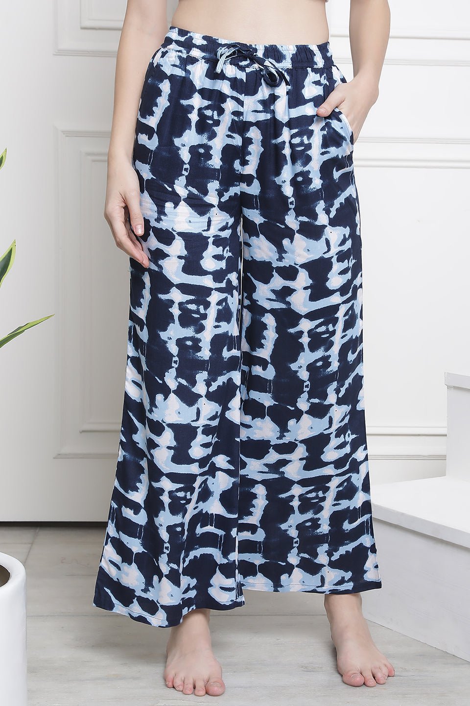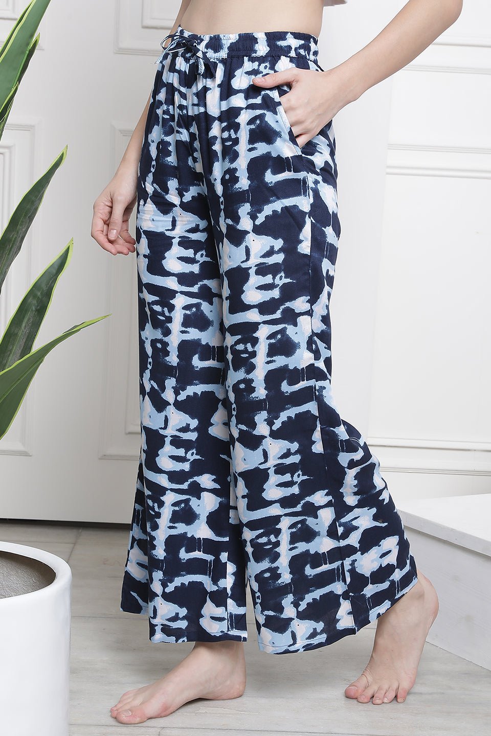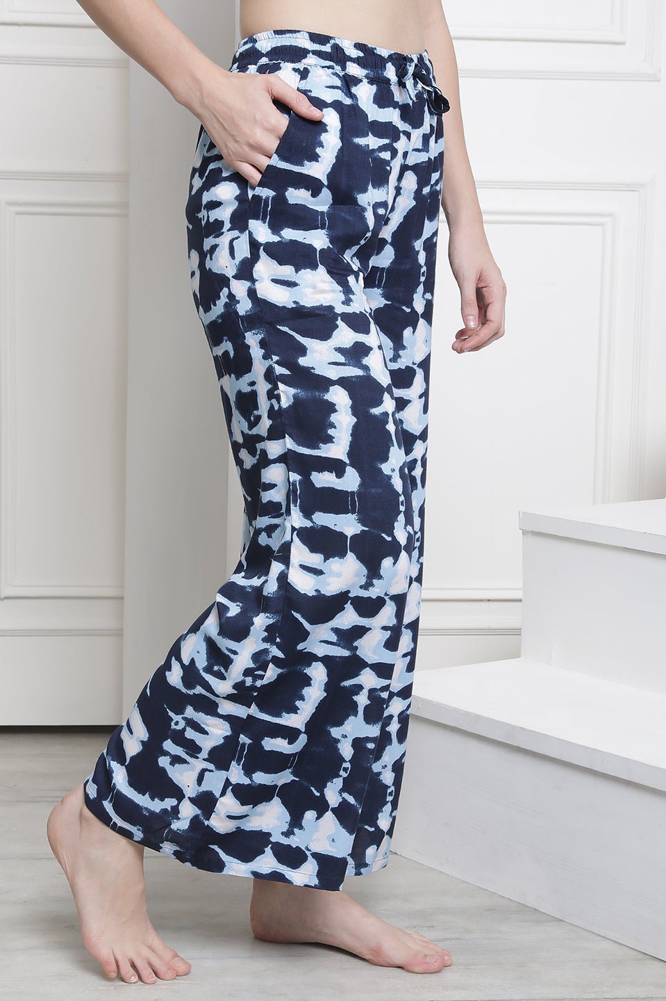 Navy Blue Flared Printed Viscose Rayon Lounge Pants